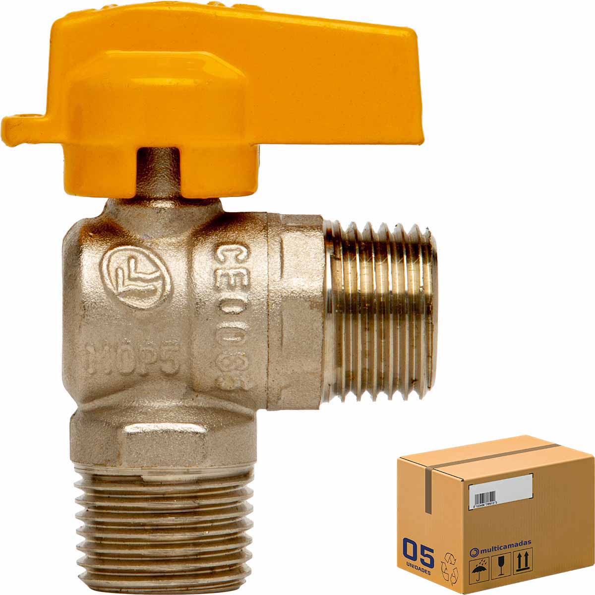 Registro esfera (válvula esfera) angular 90 graus, para gás GLP (gás de botijão) ou GN (gás natural), roscas 1/2" NPT x 1/2" NPT.